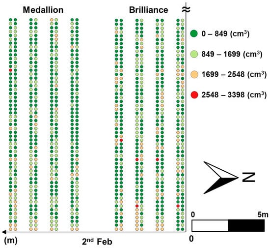 The canopy volume of the Brilliance variety in the east of the field increased over time. However, the canopy volume of the Medallion variety in the east of the field remained at a similar level over the same period. This result indicates that the canopy volume distributions of the two cultivars are different and should be managed individually. The canopy volume in both varieties increased by the second week. The Brilliance variety showed a noticeable decline in canopy volume on 16 February, while the Medallion variety recorded a slight reduction on the same day. By 23 February, both varieties exhibited fluctuating growth trends. Canopy volumes increased until the second week and then decreased, as illustrated in Figure 11 and Figure 12. These changes in canopy volume observed in the distribution maps correspond to those measured using EPS balls for 40 sampled plants, as shown in Figure 13. These similarities suggest that the distribution maps based on the models developed in this study can effectively provide an overview of canopy volumes across the entire strawberry field.