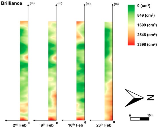 Canopy volume distribution of the Brilliance variety from 2 to 23 February 2024.