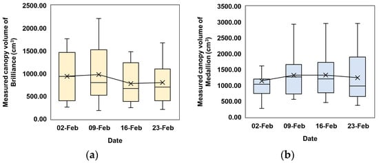 Box plots of weekly canopy volumes of the sampled plants measured using the EPS balls: (a) Brilliance variety; (b) Medallion variety for 40 sampled plants.