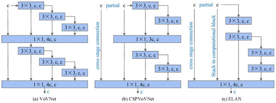 Schematic diagram of the Efficient Layer Aggregation Network (ELAN). (a–c) represent the network structures of VoVNet, CSPVoVNet, and ELAN, respectively.