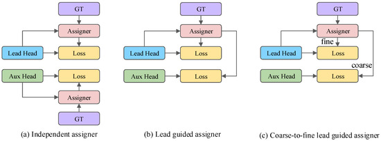 Coarse for auxiliary and fine for lead head label assigner. (a–c) represent three different label assignment methods, respectively.