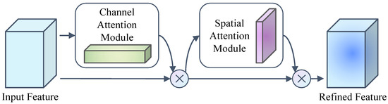 The CBAM module is a simple but effective feed-forward convolutional neural network attention module. The module contains two independent sub-modules, namely a channel attention module and a spatial attention module, which receive the output result F ∈ RC×H×W of an intermediate convolutional layer as feature data input. The intermediate feature data are obtained by sequentially obtaining a channel attention feature map Mc ∈ RC×1×1 and a spatial attention feature map Ms ∈ R1×H×W under two different dimensions; that is, it passes through a channel attention module first, and after the weighting calculation of this channel attention module, it will be further weighted by a spatial attention module. In order to make the feature output more refined each time in different dimensions, the attention feature map after each attention weighting computation will be multiplied by the input feature map for adaptive feature refinement, and the final output result will be obtained. The process can be expressed as: