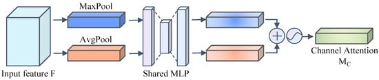 Channel attention module: The sub-module first aggregates the spatial information of the input feature maps by performing maximum pooling and average pooling operations on the input feature maps, respectively, so as to obtain the maximum pooling feature and the average pooling feature of the input feature maps. Then, these two pooled features obtained through different operations are fed into a multi-layer perceptron shared network with a hidden layer. After passing through the shared network, these two pooled features obtain a channel attention feature map Mc ∈ RC×1×1. Finally, these two output feature vectors processed by the shared network are merged using element-by-element summation. The structure of the channel attention module is shown in Figure 7. The calculation formula is as follows: