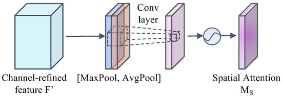 Spatial attention module: Unlike channel attention, spatial attention focuses on location information and is complementary to channel attention. The principle of this sub-module is to take the feature map output from the channel attention module as the input. Firstly, the input feature map is subjected to maximum pooling and average pooling operations to aggregate the channel information of the feature map, and the maximum pooling feature ∈ R1×H×W and the average pooling feature ∈ R1×H×W of the input feature map are obtained, and then the two pooling features are subjected to channel splicing operations based on the channels. Then, a 7 × 7 convolutional layer and sigmoid activation function are used to generate the spatial attention feature map Ms ∈ RH×W. The structure of the spatial attention module is shown in Figure 8. The spatial attention is calculated as follows: