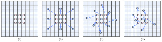 Sampling positions in 3 × 3 standard and deformable convolutions. (a) standard convolution sampling method; (b,c) denotes the special transformation case where deformable convolution generalizes the offset, offset direction and rotation; (d) general sampling method for deformable convolution.