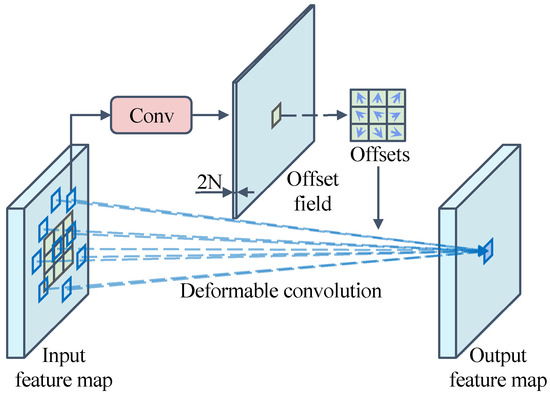 The acquisition of offset is shown in Figure 10. For a 3 × 3 deformable convolution, the offset output required for deformable convolution is first obtained by applying a convolution layer on the same input feature map (the number of offset field channels of the output is 2N, which represents the offsets in the x and y directions), and then the obtained offset is applied to the convolution kernel to achieve the deformable convolution effect.