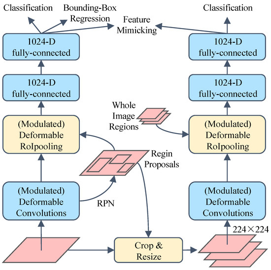 The network architecture of the deformable Faster R-CNN used for training is shown in Figure 12. Firstly, the RoI b used for feature imitation is given, and the corresponding image blocks are cropped and resized to 224 × 224 pixels. In the R-CNN branch, the backbone network operates on the resized image blocks and generates feature maps with a spatial resolution of 14 × 14. The modulated deformable RoI pooling layer is then applied to the top of the feature map. Afterwards, two fully connected layers of 1024-D are applied to generate R-CNN features of the input image block, denoted by fRCNN (b). Similarly, Faster R-CNN features corresponding to the R-CNN features are denoted by fFRCNN (b). The classification is then performed using a Softmax classifier, and the feature simulation loss is defined on the cosine similarity between fRCNN (b) and fFRCNN (b), which can be calculated as: