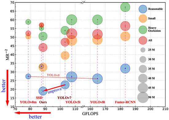 As can be seen from the results of the comparison experiments in Table 4, the improved YOLOv7 pedestrian detection network model in this paper is 12.34% lower than the MR−2 of the Two-Stage object detection network Faster-RCNN (Resnet50 + FPN) model in terms of comprehensive performance, and the values of MR−2 are reduced by 17.84% and 16.78% on the subsets of small-object pedestrians as well as occluded-object pedestrians, respectively. The values of MR−2 are 12.89%, 7.96%, and 7.6% lower than those of the same One-Stage stage algorithm models SSD (vgg512), YOLOv5l and YOLOv8. On subsets of small-object pedestrians, the values of MR−2 are reduced by 24.25%, 15.49% and 15.87%, respectively, and on subsets of occluded-object pedestrians, the values of MR−2 are reduced by 4.59%, 9.49% and 9.5%, respectively. This paper also carried out comprehensive analysis of the number of parameters, the amount of calculation and MR−2, as shown in Figure 15, The horizontal axis of this graph represents the GFLOPS, and the vertical axis represents MR−2. Their values are better when smaller. Therefore, in the graph, the closer it is to the lower left corner of the coordinate axis, the better the performance. The size of the bubbles in the graph represents the number of parameters. Different colors represent the pedestrian target detection performance under different subsets. The smaller the bubble, the better. Bubbles with the same horizontal axis coordinate represent the detection results of the same model under different subsets. The same model is labeled with a label at the bottom of the graph using a dotted line. According to the comparison results, it can be seen that the improved model only increases the number of parameters by 0.2 M, which is almost negligible, but the amount of calculation and MR−2 have been reduced to a large extent, and the improved YOLOv7 model has a very good performance in parameter quantity, calculation amount and comprehensive performance of MR−2.