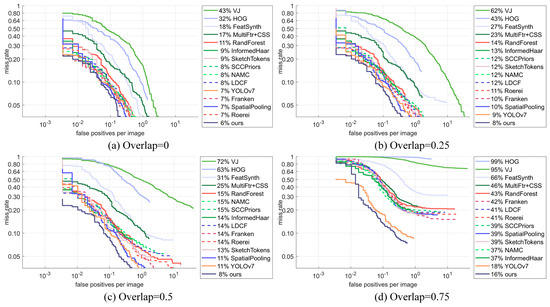 As can be seen from the results of the comparative experiments in Table 5, the improved YOLOv7 pedestrian detection network model in this paper achieved excellent performance in all subsets compared with other existing pedestrian object detection networks in terms of the MR−2 evaluation indexes for the four subsets with overlap degrees of 0, 0.25, 0.5 and 0.75. In the detection of non-overlapping pedestrian object subsets on the INRIA dataset, the MR−2 of the original YOLOv7 was 7.31%, and the MR−2 of the improved YOLOv7 model was reduced by 1.3%, reaching 6.01%, which outperforms the existing pedestrian detection algorithms of Franken, SpatialPooling and Roerei compared to the pre-improvement period. In the subsets with overlapping degrees of 0.25 and 0.5, the MR−2 were 7.74% and 8.33%, respectively, which were reduced by 1.16% and 2.6% compared to the MR−2 pre-improvement. The MR−2 of the improved YOLOv7 model was 15.94% in the subset of 0.75 degree of overlap; compared with the pre-improvement MR−2, this was 2.25% lower. Compared with the other pedestrian detection network models compared in this paper, it was 21.1% lower than the best-performing InformedHaar model in the subset with an overlap degree of 0.75. In order to observe the comparison results more intuitively, the MR-FPPI curves under different subsets of overlap degree are plotted, as shown in Figure 17. Through the performance comparison mentioned above, the improved YOLOv7 model has excellent performance for pedestrian objects with different overlapping situations, and the recognition performance for severely overlapped objects with an overlap degree of 0.75 is particularly significant.