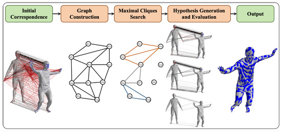 However, a significant limitation of these methods is their heavy reliance on the accuracy of the initial sparse correspondences. In the context of rigid point clouds, correspondence without outliers has been extensively researched due to the less stringent requirements of rigid transformations. Techniques involving maximum and maximal cliques with Euclidean distance can generate more accurate correspondences [14,15,16]. In these approaches, the preliminary set of correspondences is conceptualized as a compatibility graph, where each vertex represents a single correspondence and each edge signifies a pair of compatible correspondences. Subsequently, maximum or maximal cliques are identified within the graph, and a node-guided clique vetting procedure is employed to meticulously associate each graph vertex with the corresponding maximal clique that contains it.