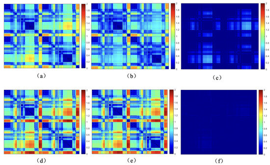 In this paper, we employ geodesic distances between point clouds to assess the spatial compatibility of two sets of correspondences, as shown in Equation (1). The fundamental idea is that, for any two correctly matched correspondences and , the geodesic distance between the deformed original points and and the geodesic distance between the deformed points and should remain the same. Taking the non-rigid motion of the human body as an example in Figure 3, (d) represents the geodesic distances between points of the source point cloud, (e) represents the geodesic distances between points of the target point cloud, and (f) represents the difference in geodesic distances between corresponding points, which remains largely unaffected by non-rigid deformations.