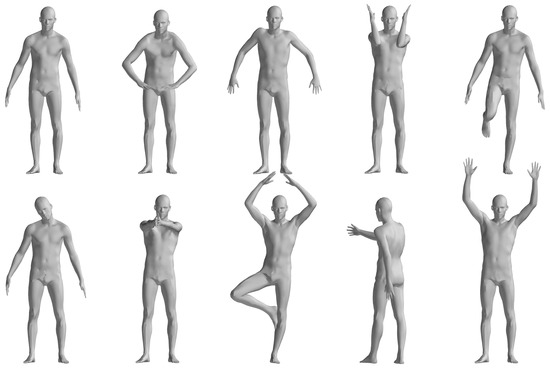 - Loper, M.; Mahmood, N.; Romero, J.; Pons-Moll, G.; Black, M.J. SMPL: A skinned multi-person linear model. ACM Trans. Graph. (TOG) 2015, 34, 1–16. [Google Scholar] [CrossRef]