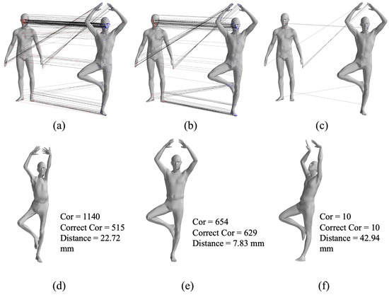 For rigid transformations, Euclidean distance and normal vector distance are used as constraints in point cloud registration, similar to the metrics used in the Iterative Closest Point (ICP) algorithm. However, these metrics are not suitable for non-rigid point cloud registration, particularly for human body deformations, as they fail to capture the non-rigid deformation relationships. The complex movements of the human body lead to local relative deformations, as shown in Figure 2, which increase the number of parameters required for registration. In this case, the Euclidean distances between corresponding points (Figure 3a,b) also change due to non-rigid movements. Figure 3c shows the changes in Euclidean distances between corresponding points.
