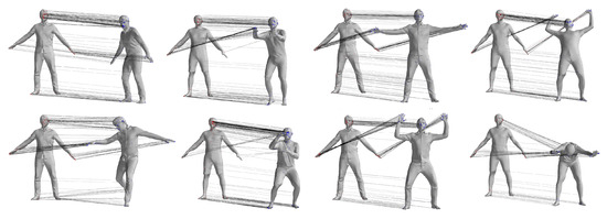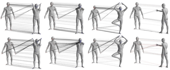 The CAPE dataset consists of 15 individuals wearing different types of clothing while performing various actions. For this experiment, individual 00096 was selected, and 20 poses from 10 action sequences were chosen for non-rigid registration and human pose estimation which included Soccer, Chicken Wings, Basketball, Squats, Flying Eagle, Punching, Bend Back and Front, ATU, and Pose Model. The same algorithms used for the FAUST dataset were employed to process these data. Table 2 details the registration results for the pose pairs in actions 1–10. Figure 7 provides visual representations of the matching results between the two pose pairs from four different action categories.