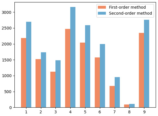 In order to illustrate the advantages and effectiveness of second-order methods over first-order methods, we compare the number of correct matches obtained by the two methods from the FAUST dataset in Figure 8. The result shows that the second-order method can produce more correct correspondence for the nine pose pairs. As a matter of fact, the first-order spatial compatibility can be disturbed by the ambiguity problem, which refers to situations where the clustering algorithm has difficulty determining the correct cluster assignments due to overlapping or unclear cluster boundaries. The second-order spatial compatibility measure can decrease the likelihood of the outlier being included in the consensus set and thus minimize the ambiguity issue. Consequently, by tackling this challenge, the second-order method has the potential to deliver superior performance in clustering endeavors.