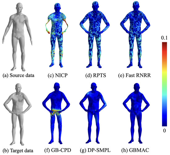 This section compares the non-rigid human body pose registration results obtained by various algorithms from the FAUST dataset. Figure 9 displays the 0–1 pose pair, with source and target data in (a) and (b) and registration outcomes in (c)–(h), using a color gradient to indicate errors (0 to 0.1 m). From the figure, we can see that the NICP algorithm tends to cause local distortions with large movements. Non-model-based methods like RPTS and Fast RNRR perform well with accurate matching points. The experiment used DP-generated matching pairs, which were less accurate than manually selected points. The GBCPD algorithm combines geodesic and Euclidean distances, leading to abdominal misalignment with hand movements. DP-SMPL, using DP-generated points and model-based optimization, performs well with accurate matches but suffers from mismatches.