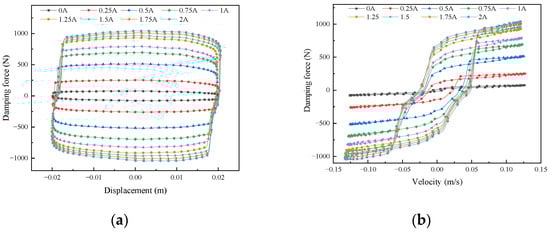 Mechanical characteristics of magnetorheological damper under different currents. (a) Damping force-displacement. (b) Damping force-velocity.