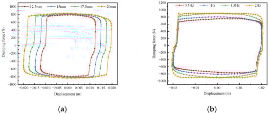 In order to investigate the influence of the amplitude and frequency of the input excitation on the output damping force of the damper, the sinusoidal excitation frequency of the test platform was set to 1 Hz. The input current of the magnetorheological damper was set to 1 A. The amplitude of the excitation was varied in increments of 2.5 mm from 12.5 mm to 20 mm, which resulted in the relationship between the output force of the damper and the size of the amplitude, as shown in Figure 4a. The sinusoidal excitation amplitude of the test platform was set to 20 mm, the magnetorheological damper input current was set to 1 A, and the excitation frequency was varied in 0.5 Hz increments from 0.5 Hz to 2 Hz. The relationship between the output force of the damper and the magnitude of the frequency was measured, as shown in Figure 4b.