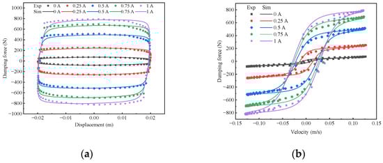 Comparison between the simulation results of the forward model and the experimental data. (a) Damping force-displacement. (b) Damping force-velocity.