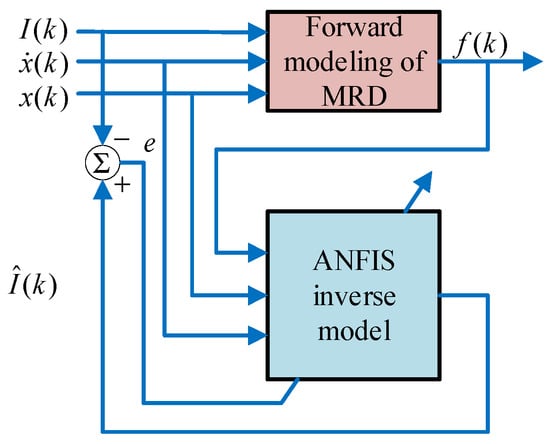 The displacement, velocity, and desired damping force data of the magnetorheological damper piston are used as inputs by the inverse model system to determine the input current of the magnetorheological damper. The principle of the adaptive neuro-fuzzy inference inverse model of magnetorheological damper established in this paper is shown in Figure 7. The experimental data of displacement, velocity, and damping force under the specific current of the magnetorheological damper are used as the input of the ANFIS inference system. The output of the inverse model is the inference current. The inference system is then corrected continuously according to the error of the inference current and the experimental current until the inference system achieves a certain level of accuracy.