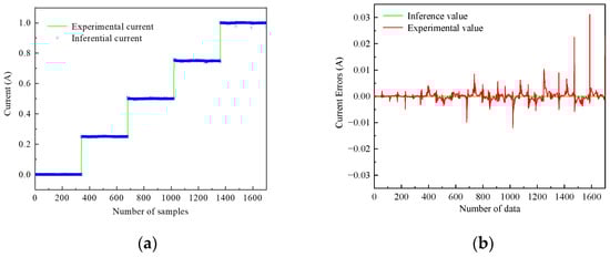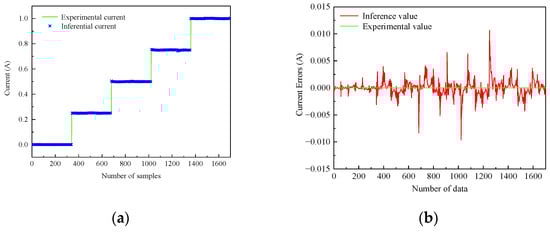 Figure 8 shows the comparison between the experimental values and the inference values in the training data of the inverse model of the magnetorheological damper. It can be seen that the ANFIS inverse model of the magnetorheological damper in the training data can track the experimental values very well, and the inference error is within 0.01 A, which is an excellent inference accuracy.