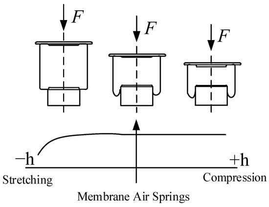 Compared with coil springs, air springs have the advantages of low natural vibration frequency, adjustable stiffness, long service life, and low noise. In addition, air springs have nonlinear muscular stiffness characteristics, and they can show better wheel grip when driving in complex road conditions. When the suspension spring mass changes, its intrinsic frequency does not change much [24]. The schematic structure of the air spring is shown in Figure 10.