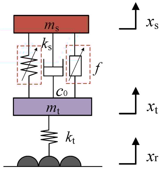 From the mechanical model established in Figure 11, the differential equation of motion of the suspension system can be established according to Newton’s dynamics law: