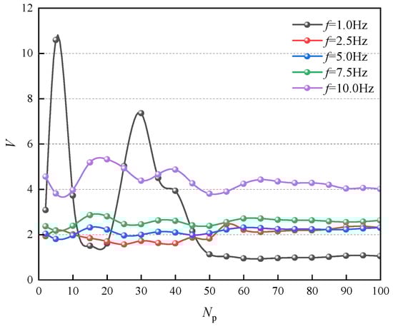 where : root mean square (RMS) of sprung mass acceleration, : RMS of sprung mass acceleration of passive suspension, : RMS of dynamic tire deformation, : RMS of dynamic tire deformation of passive suspension, : RMS of suspension deflection, : RMS value of suspension deflection of passive suspension. The smaller the value of the evaluation index V of the suspension frequency test, the better the comprehensive performance of the suspension and the better the control effect of the controller. The results of different frequencies of sinusoidal excitation input with different predictions of the controller for horizon control simulation are shown in Figure 12.