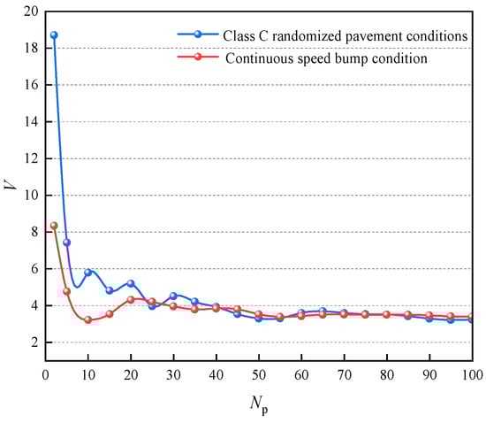 In order to further verify the influence of the prediction horizon on the vehicle suspension performance in actual road conditions, a random road surface model with a vehicle speed of 10 m/s on a class C road surface and a continuous speed bump road surface model with a vehicle speed of 10 m/s are established. They are applied to the road surface excitation inputs of the magnetorheological semi-active air suspension model, respectively. The prediction horizon of the model prediction controller is optimized and analyzed using the suspension vibration evaluation index V established above as the measurement basis.