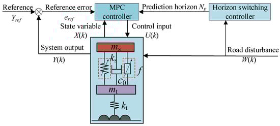 As can be seen from Figure 13, the variation trend of the suspension damping effect with the prediction horizon for the C-class random road condition is basically the same as that of the low-frequency sinusoidal excitation with the prediction horizon, and the best part of the damping effect is in the long prediction horizon part. The best prediction horizon in the continuous speed bump condition is Np = 10 steps; at this time, the C-class random road condition is not the best prediction horizon for the vibration-damping effect. This proves the necessity of VHMPC. The control block diagram of VHMPC is shown in Figure 14.