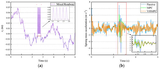 From the data in Figure 15 and Table 3, it can be seen that compared with passive suspension, MPC has a significant improvement in sprung mass acceleration (SMA), which can improve the smoothness of the vehicle by 23.449%, and VHMPC has a significant improvement on sprung mass acceleration, which can improve the smoothness by 25.451%; the two types of MPC under actual conditions have an improvement on the smoothness of vehicle driving under the actual conditions, both MPCs have improved the smoothness of the vehicle, indicating the effectiveness of the MPC to improve the smoothness of the vehicle; VHMPC suspension vehicle smoothness is the best, VHMPC relative to the MPC vehicle smoothness improved by 2.614%, in the discrete impact road (such as speed bumps) conditions, the sprung mass acceleration of the positive peak decreased by 11.849%, the negative peak decreased by 6.938%. The impact on passengers is significantly reduced, and the ride comfort is greatly improved.