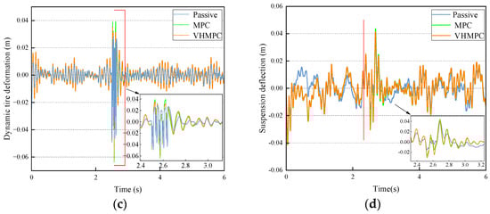 The braking deceleration process of the vehicle in front of the speed bump is not considered in the simulation. The passive suspension system (passive), traditional MPC, and VHMPC suspension system are simulated under the same road conditions. The comparison curves of sprung mass acceleration, dynamic tire deformation, and suspension deflection in the time domain for each type of suspension are shown in Figure 15. Their statistical properties are shown in Table 3.