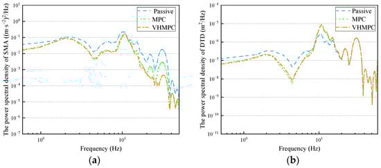 As can be seen from Figure 16a, under mixed conditions, the sprung mass acceleration of VHMPC suspension has the lowest power spectral density in the low-frequency, medium-frequency, and high-frequency regions. As a result, the ride comfort of the VHMPC suspension is better than that of the MPC suspension and passive suspension. The VHMPC suspension is superior to MPC suspension and passive suspension in terms of power spectral density of dynamic tire deformation in the low-frequency and medium-frequency regions. In the high-frequency resonance region, the power spectral density of dynamic tire deformation and suspension deflection is worse for VHMPC suspension and MPC suspension than for passive suspension.