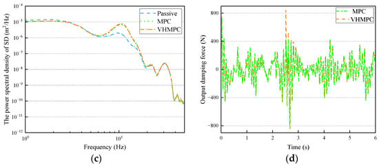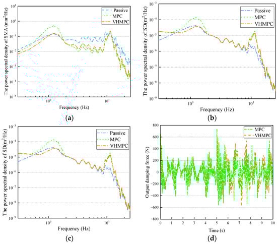 Frequency domain comparison of VHMPC suspension performance indexes for mixed roadway. (a) Sprung mass acceleration (SMA). (b) Dynamic tire deformation (DTD). (c) Suspension deflection (SD). (d) Output damping force.