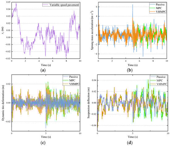 Time domain comparison of VHMPC suspension performance indexes for variable speed pavement. (a) Variable speed pavement excitation input. (b) Sprung mass acceleration. (c) Dynamic tire deformation. (d) Suspension deflection.
