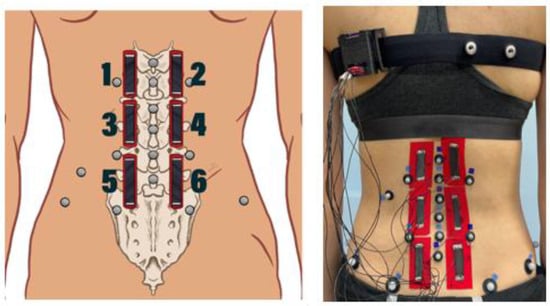 MT was used to measure muscle engagement during test conditions. Six MTs were placed on the low back, lateral to the spinal column and patterned in a 3 × 2 matrix (Figure 1). This configuration was selected to monitor three different regions of the low back (upper, lower, lumbopelvic) and to parallel the EMG placement and motion capture sensor placement from an existing spine model [22,23,24]. The use of three pieces of tape on each side of the low back also allows for more freedom of movement relative to a single piece of tape on each side of the low back. This configuration was validated for measuring low back movement in a previous study [18]. The same Physical Therapist clinician-researcher (SPG), with 20+ years of experience in optical motion capture of the spine, performed all placements. The placement of the MTs started with the middle MTs (sensors 3 and 4) to ensure that the bottom edges of the middle MTs were placed at a level just above the L4 spinous process and crossed the L2-L3 and L3-L4 junctions for most (90%) of the participants. The superior MTs (sensors 1 and 2) were placed above the middle MTs to ensure that the superior MTs crossed the T12-L1 and L1-L2 junctions for most (90%) of the participants. The inferior MTs (sensors 5 and 6) were placed below the middle tapes so that the inferior MTs crossed the L4-L5 and L5-S1 junctions for most (90%) of the participants.