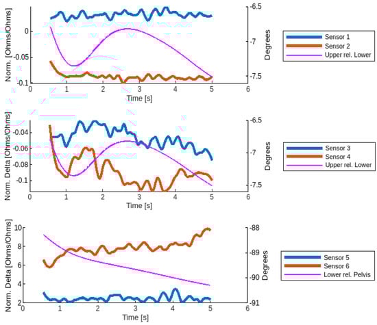 Motion Tape strain data (sensors 1–6) and lumbar kinematic data for a representative participant during a left rotation (LROT) MVIC trial.