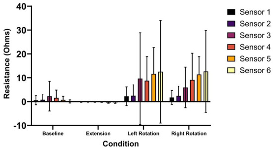 The values of the MT strain (resistance in Ω) for each sensor and condition are presented in Table 3. The results of the ANOVA indicated that there was a significant main effect of condition (p < 0.001) and a significant interaction effect of sensor and condition (p = 0.01) (Figure 3). Higher mean strain values were observed during MVIC left and right rotation compared to the baseline, while lower mean strain values were observed during the MVIC extension condition (Figure 3).