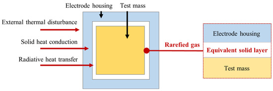 The actual inertial sensor includes complex structures such as front-end electronic equipment and high-precision positioning devices [12]. To facilitate analysis and calculation, as shown in Figure 2, the inertial sensor is simplified as a three-layer cubic structure, consisting of the electrode housing, the vacuum chamber, and the freely suspended test mass from the outside inwards. The electrode housing is a molybdenum metal cube with a side length of 80 mm and thickness of 10 mm, while the test mass is a gold–platinum alloy cube with a side length of 50 mm and a mass of 2.5 kg. The two are separated by a 5 mm vacuum cavity, designed to minimize the effect of gas flow on the acceleration measurement of the system. The interior wall of the electrode housing and the outer wall of the test mass are covered with a thin layer of gold plating of about 500 nm to reduce the surface emissivity to 0.02 and reduce the heat transfer from the vacuum layer to the test masses. When analyzing the influence of temperature effects, the two electrode housings on opposite sides are modeled as infinite flat plates, and the system average temperature of the inertial sensor is assumed to be . With the high thermal conductivity of the electrode housing material and weak surface temperature perturbations (~), it can be assumed that temperature fluctuations on the surface are much smaller than . In addition, since the thermal conductivity of the test mass material (314 W/(m·K)) is much higher than the equivalent thermal conductivity of the high vacuum insulating layer ( W/(m·K)), the test mass can be considered isothermal at .