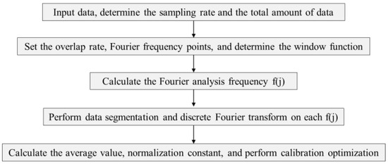 The measurement and evaluation of noise can usually be carried out in both the time and frequency domains. The time domain is mainly used to measure and collect gravitational wave and various noise signals. However, weak gravitational wave signals are often easily masked by noises, so it is necessary to extract, identify, and analyze these signals through the frequency domain [16]. In this paper, the Logarithmic frequency axis Power Spectral Density (LPSD) is used to analyze frequency domain characteristics. Compared to other methods, this noise assessment method adopts different frequency resolutions for different Fourier analysis frequencies and processes data in segments. This method can solve the problem of discontinuity in segmentation and burrs in high frequency bands in the case of large data volumes and wide bandwidths [17]. The specific steps of the LPSD algorithm are shown in Figure 8, which mainly include the selection of the logarithmic frequency, the segmentation of the data, and the normalization of the power spectrum.