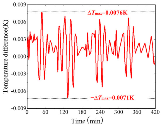 Figure 10 illustrates the temperature difference between the upper and lower relative surfaces of the electrode housing over a period of 0~420 min. The temperature difference curve obtained from the simulation calculation exhibits periodic fluctuations. Similar to the cyclic fluctuations of the temperature boundary, the period of the temperature difference fluctuation is 5750 s. From the extreme value range of the temperature data, the maximum temperature difference is 0.0076 K, which is much smaller than the fluctuation amplitude of the temperature boundary condition (~0.02 K). The attenuation of the amplitude is approximately 2.5 times, which indicates that after the active thermal control system, the temperature fluctuation amplitude is significantly reduced.