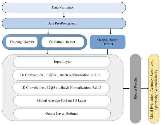 The overall CNN architecture is shown in Figure 2. The proposed CNN model is a one-dimensional stacked CNN (1DSCNN) model. This CNN model is composed of a 1D input layer, two convolutional layers (each with 32 filters and a kernel size of 3), and a global average pooling layer. Batch normalization is applied after each convolutional layer to adjust the activations of the previous layer across the batch. Rectified linear unit (ReLU) activation functions are used to introduce non-linearity in the network after each batch normalization layer. Global average pooling is applied after the second convolutional layer to convert the feature maps into a single feature vector by taking the average of all feature maps across each channel. This reduces the dimensionality of the feature representation. A dense layer with a softmax activation function is used as the output layer to map the feature vector to the class probabilities. The number of neurons in the output layer is equal to the number of classes in the classification task.