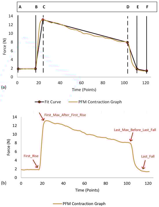 In our efforts to analyze PFM contraction data, we first used a code designed to fit the data to a trapezoidal function. This approach aimed to minimize the difference between the function and the actual data by adjusting parameters while adhering to constraints on the slopes of the rising and falling edges. Despite the theoretical robustness of this method, our rule-based feature extraction algorithm proved to be more effective. The superior performance of the rule-based algorithm can be attributed to its ability to incorporate specific clinical constraints—key parameters of the model—into the feature extraction process. These constraints include the points B, C, D, and E, which define the critical phases of the maximal pelvic floor contraction. By ensuring that the extracted features align with these clinically relevant parameters, the rule-based algorithm enhances the practical utility of the analysis in real-world clinical settings.
