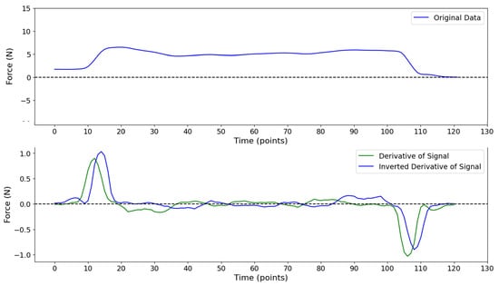 To detect the last fall (refer to Figure 3), we developed a function called “Detect Last Fall”. The last fall is defined as the point where the contraction ends, marked by a significant decrease in the signal (point E in Figure 3). Specifically, a significant decrease is identified when the derivative of the force signal falls below a specified threshold, indicating that the force is decreasing at a rate that suggests the end of the contraction. Similar to the detection of the first rise, the “Detect Last Fall” function utilizes a threshold-based method. It takes a derivative data array and a list of threshold values as inputs. To transform the last fall point into a first rise scenario, the y-values of the derivative signals are reversed and mirrored with respect to the x-axis. This inversion effectively turns the detection of the last fall into the detection of a first rise, simplifying the process. Figure 4 illustrates an example of a PFM contraction signal along with its corresponding first derivative and inverted first derivative curves. The function then iterates through the list of threshold values, searching for indices where the derivative data exceeds the current threshold. Once the function identifies the first point where the derivative surpasses the threshold, it returns this index as the last fall point. The actual index of the last fall is then calculated by subtracting the obtained index from the total number of points, effectively mapping the detected point back to its original position in the signal.