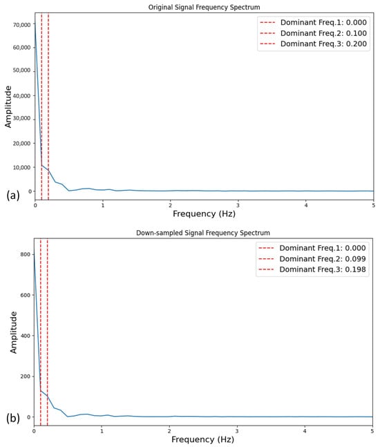 where is the measured value at time t for the original signal and is the predicted value at time t for the reconstructed signal. Additionally, the top-three dominant frequencies were calculated for both the original and down-sampled signals to compare the signal frequency spectrum. The RMSPE was also used to compare the dominant frequencies of the original signal and the down-sampled signal.