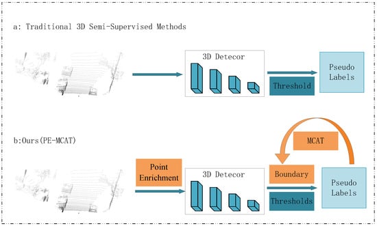 In the strategy for generating pseudo-labels, we compared our PE-MCAT method with previous methods. (a) Previous methods directly processed input data through a teacher network to initially generate pseudo-labels. Then, used a fixed threshold to select high-quality pseudo-labels. (b) The method proposed in PE-MCAT first processes the input data through point enrichment. Next, the enhanced data is input into the teacher network to initially generate pseudo-labels. Multi-class adaptive threshold (MCAT) is then applied to determine a more precise dynamic threshold. This threshold is used to filter the pseudo-labels.