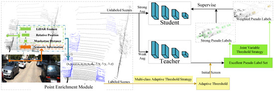 Most semi-supervised 3D object detection methods [8,9,10,11,12] adopt the teacher–student model strategy, which has become a mainstream research framework. Specifically, in this framework, the teacher model uses weakly augmented input scenes to generate pseudo-labels. Meanwhile, the student model uses the same scenes with strong augmentation as input and is trained using the pseudo-labels generated by the teacher model. The quality of these pseudo-labels is crucial to the detection performance of the student network.