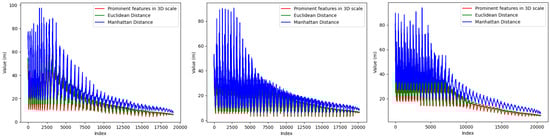 Comparison chart of the Manhattan distance, Euclidean distance, and prominent features in the three-dimensional scales of the three-frame point cloud scenes.