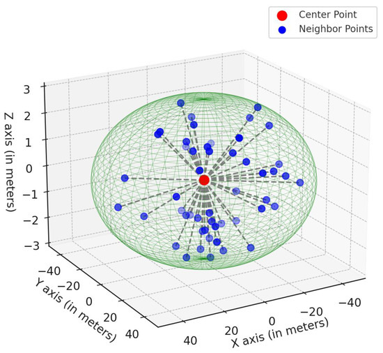 The next part is local feature fusion. On the enhanced nine-dimensional point cloud, dynamic spherical neighborhood sampling is performed, as illustrated in Figure 5. For each center point , a radius is r defined, and the neighboring points within this radius are selected. The relative position of each neighboring point with respect to the center point is then calculated, as shown in Equation (5).