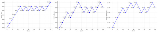 We set the IoU consistency based on and . This allows the detection network to utilize consistency constraints, providing certain generalization capabilities on augmented scenes. To ensure some level of constraint from the first iteration, we set the default IoU threshold to 0.5, as shown in Equation (8). In the first iteration, we obtain the number of instances of each class that meet the IoU threshold. In subsequent iterations, we use the number of instances of each class obtained from the current iteration’s filtering. We compare this number with that of the same class in the previous iteration. If the positive strategy for the matching threshold of that class is satisfied, we increase its matching threshold by 0.05. Otherwise, we decrease its matching threshold by 0.05. Each class’s threshold is updated independently. As shown in Figure 6, the adaptive matching threshold variation curves for the three detected object classes are displayed. Specifically, since the pre-trained model is trained on labeled samples, the model has a certain preference and sensitivity toward these samples. Therefore, we also treat the strong pseudo-labels as labeled samples and incorporate them into the generation of multi-class adaptive thresholds.